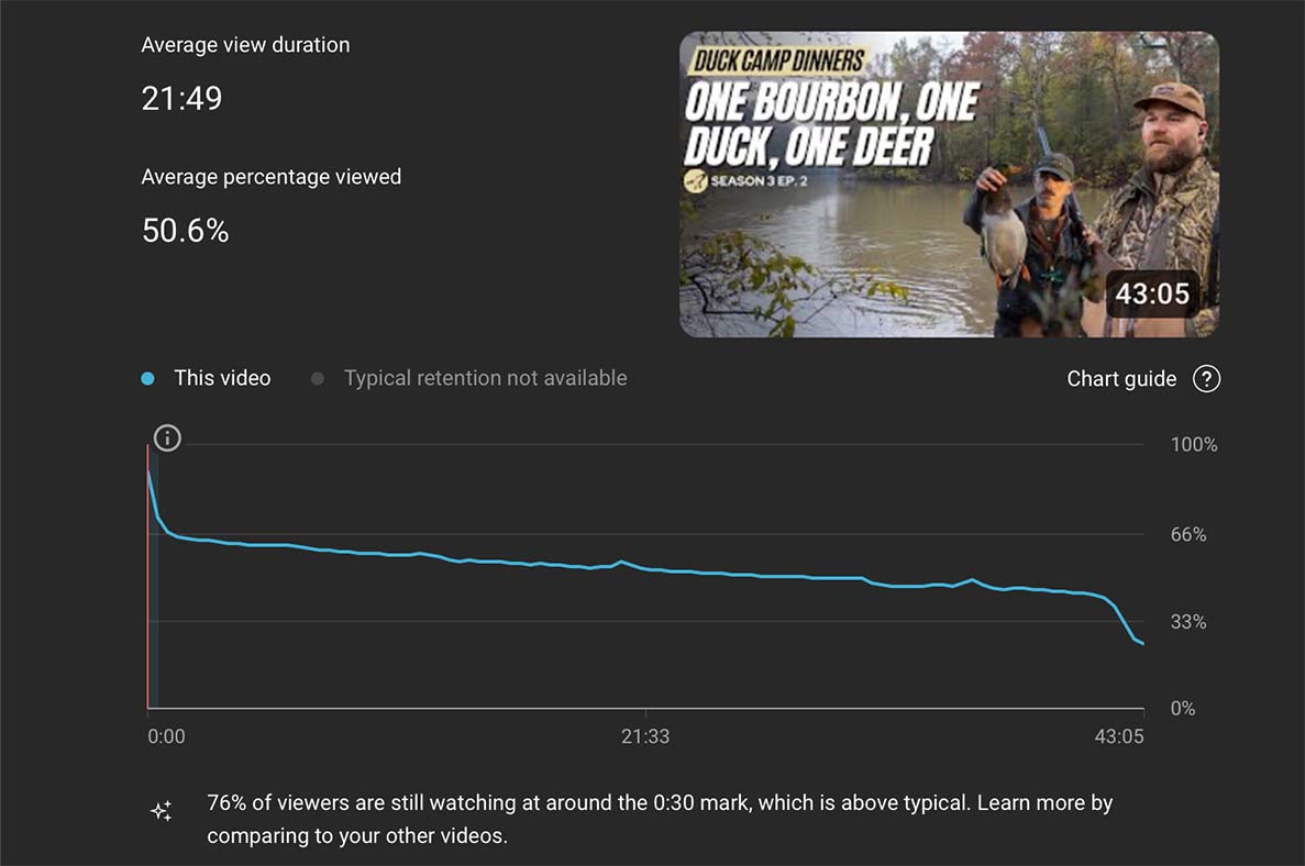 This is what a typical viewership retention graph looks like on YouTube for Duck Camp Dinners, an outdoor hunting and cooking series that I direct, shoot and edit.